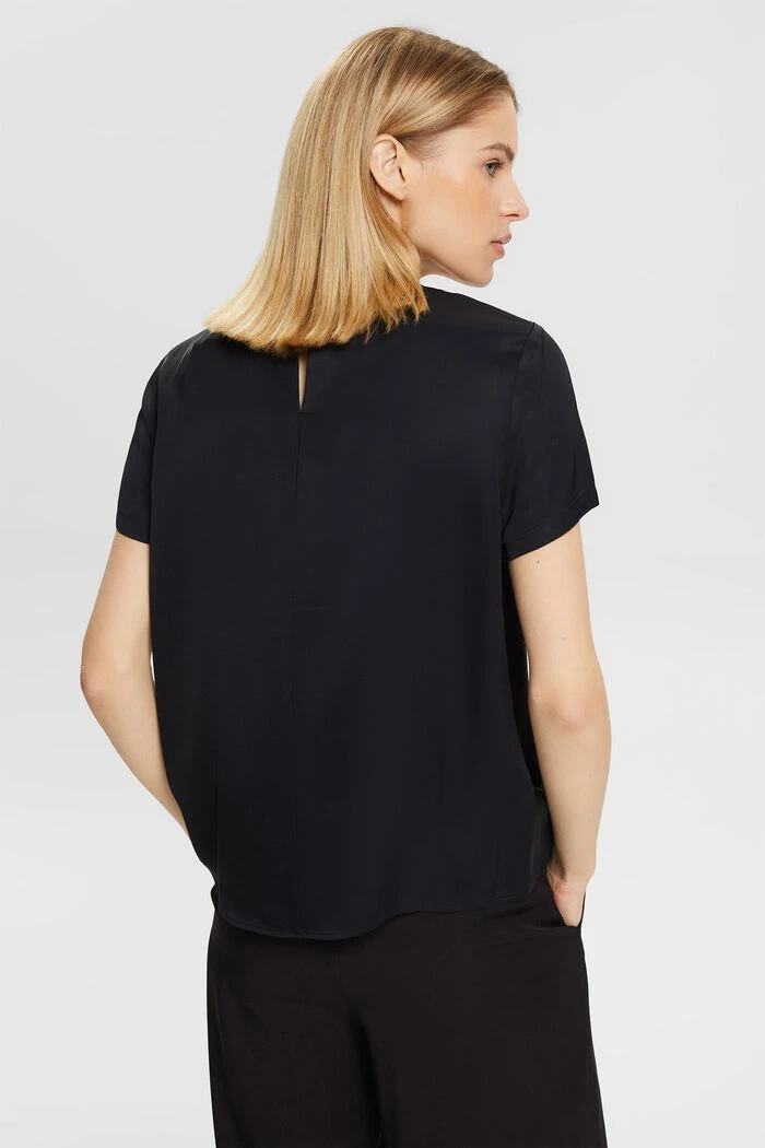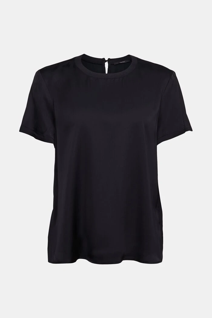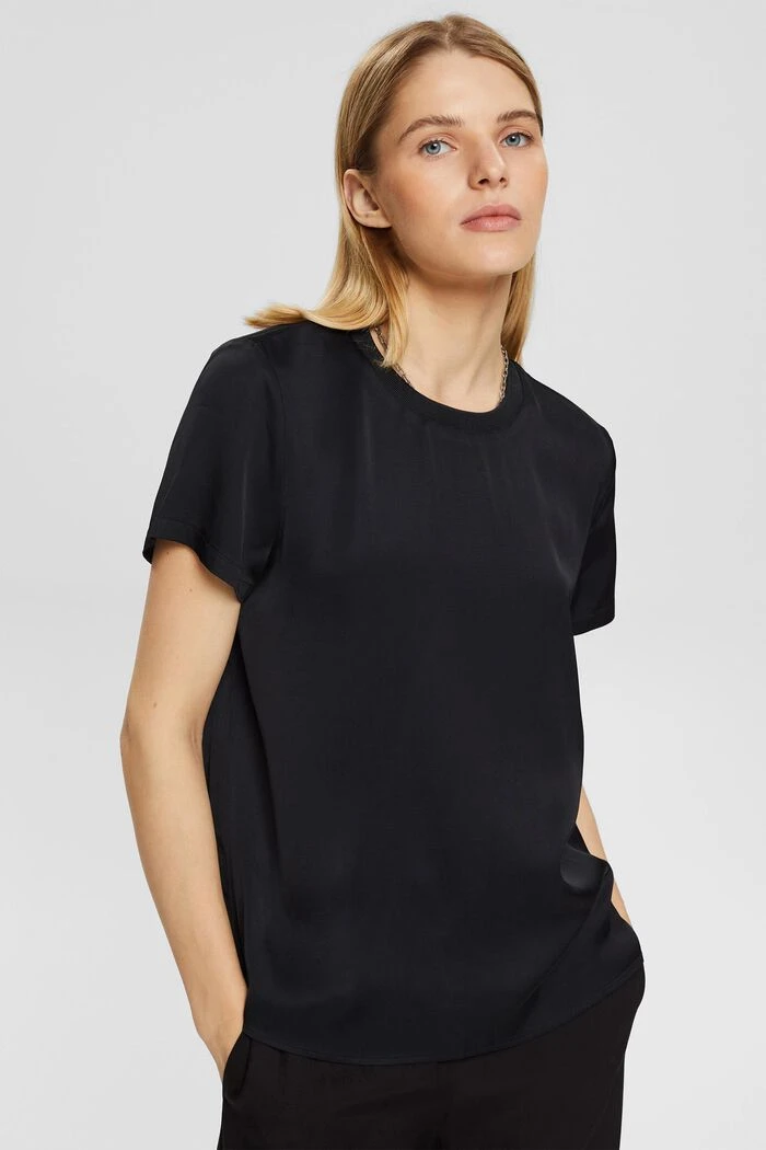 Casual Chic: bei dieser Bluse trifft elegante Satinoptik auf einen sportiv gerippten Rundhalsausschnitt.